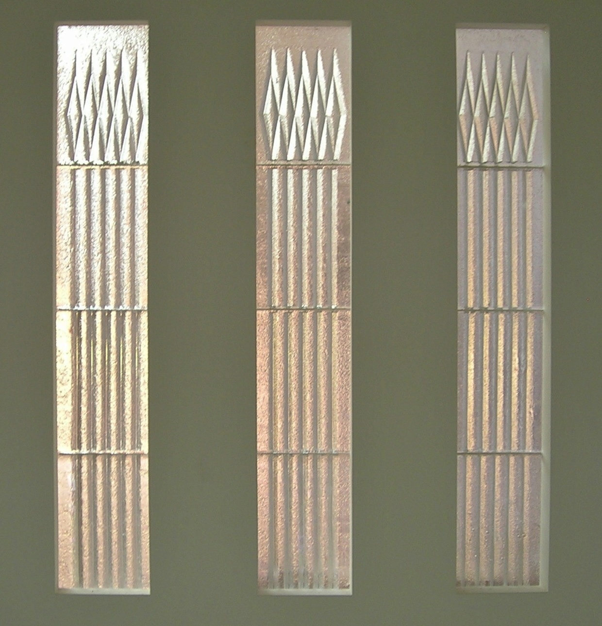 Contemporary art glass design for architecture has great potential. Blown and cast glass elements designed specifically for architectural inclusion is a concept not fully realized today. Don Gonzalez studied art and architecture and has designed and built his home to accommodate blown and cast glass elements. Don's current work is primarily casting glass in sand, a process that adapts well to architectural applications as evidenced in LOTUS, the sand cast glass studio window below. The commission of blown glass rondel windows in the former carriage house of a 14th century palazzo in Florence, Italy, is an excellent example of contemporary glass art in architecture. The Stoller Mobile illustrates this glass artist's ability to design and build a kinetic sculpture for a specific location. Below are a few examples of architectural glass installations.