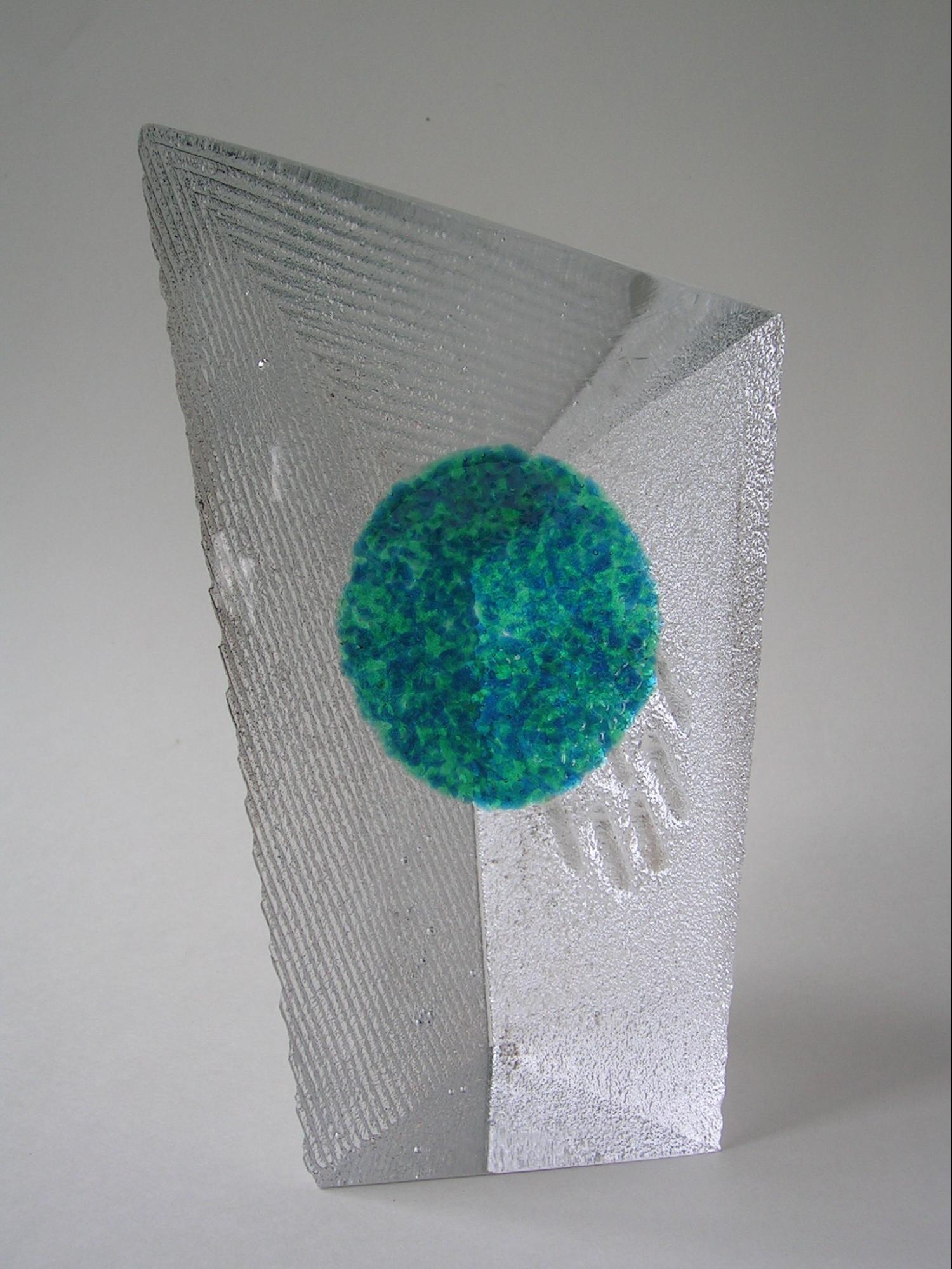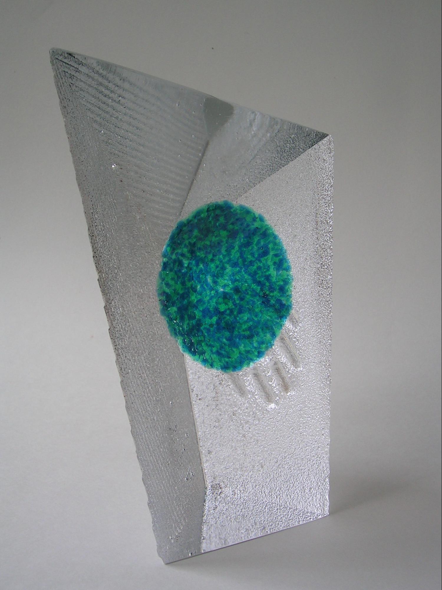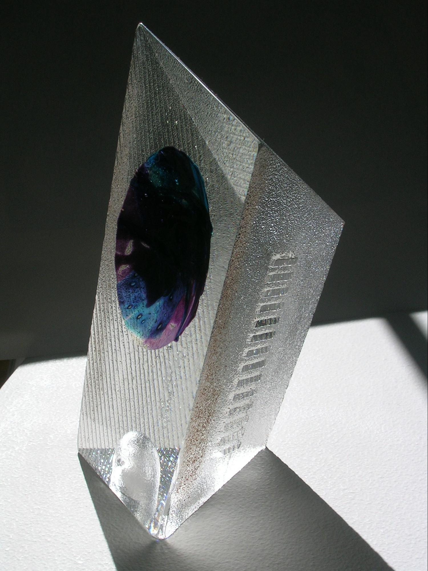 The current Art Glass designs of Don Gonzalez are primarily glass cast in sand. The sculptures are augmented with color treatments and various metals. The sand cast texture contrasts nicely with the cut and polished areas of the sculptures. The polished areas are windows that invite the viewer into the piece for a moment or two of transport. The sand cast sculptures maximize the optical qualities inherent to glass and illustrate the versatile nature of the sand cast process.
