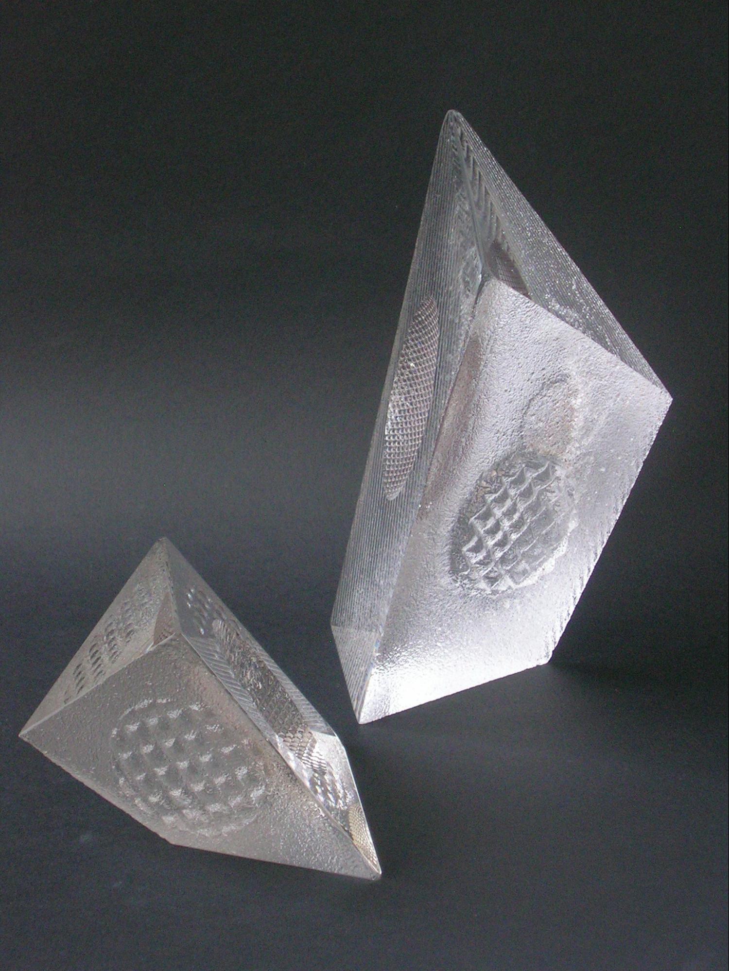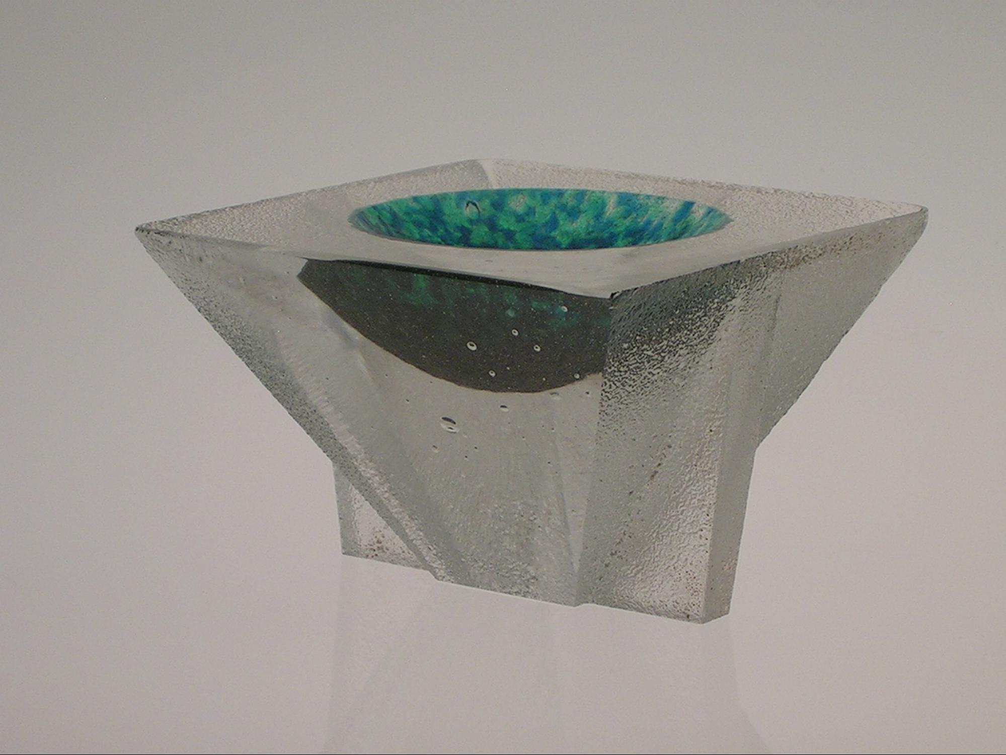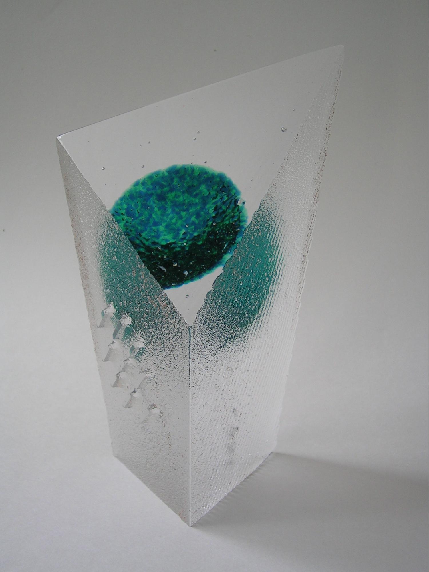 The current Art Glass designs of Don Gonzalez are primarily glass cast in sand. The sculptures are augmented with color treatments and various metals. The sand cast texture contrasts nicely with the cut and polished areas of the sculptures. The polished areas are windows that invite the viewer into the piece for a moment or two of transport. The sand cast sculptures maximize the optical qualities inherent to glass and illustrate the versatile nature of the sand cast process.