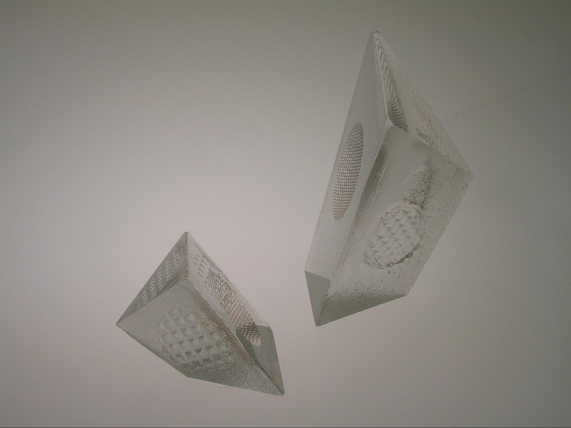 This sculpture was purchased by Jeffrey Venezia, an architect, for his private collection. It's exciting that an architect responds to the sculpture which has a reference to the new wave in architecture that challenges traditional visual concepts of symmetry and balance. The two forms are independent and provide an interactive element. The cut and polished surfaces are prism like and are windows into the castings as these surfaces reflect changing views inviting transport as one moves around the piece.